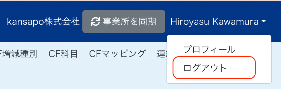 ①-1 画面ユーザー名をクリックし「ログアウト」をクリックします