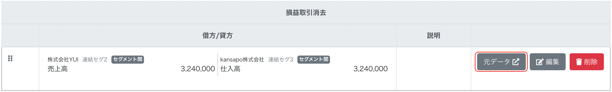 - 仕訳種別は、仕訳に資産もしくは負債が入っている場合は「債権債務消去」、入っていない場合は「損益取引消去」が自動で入ります