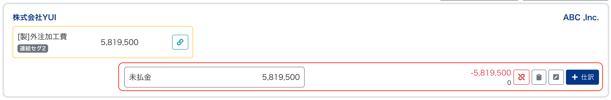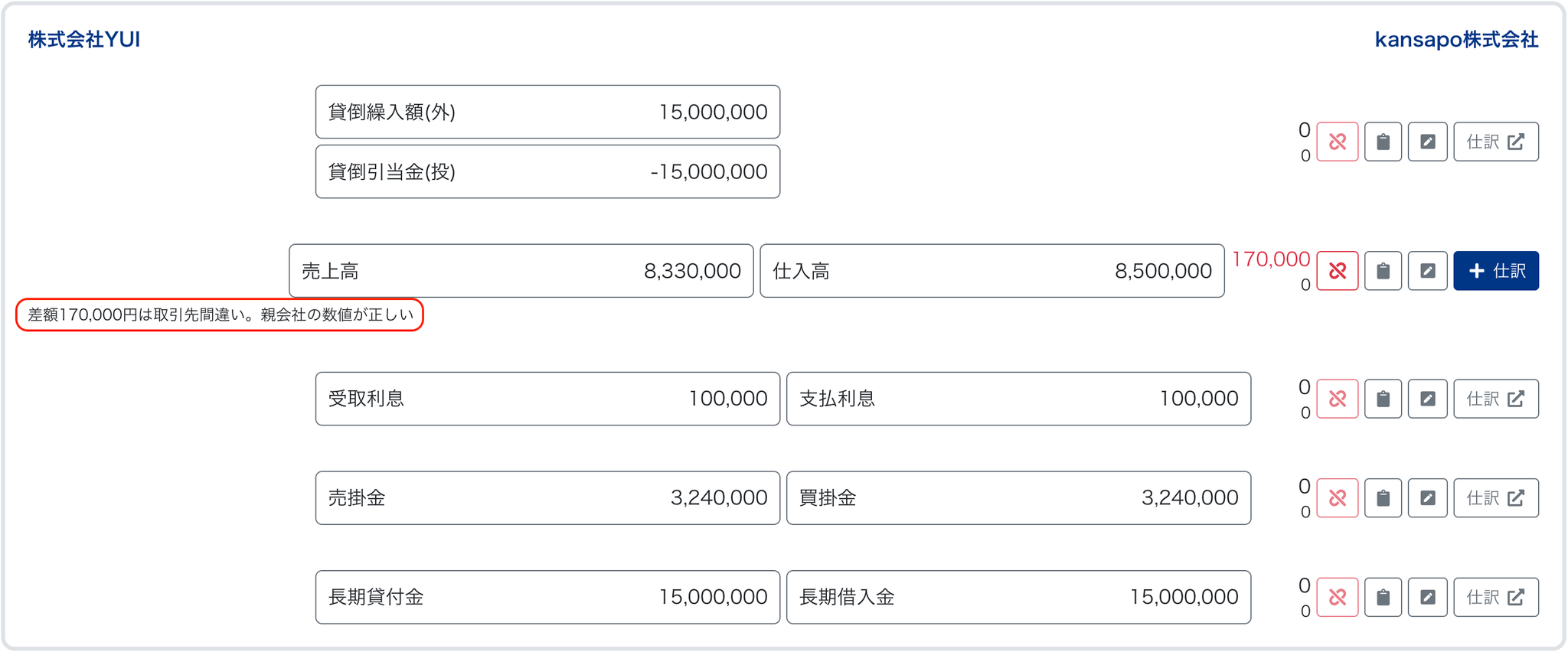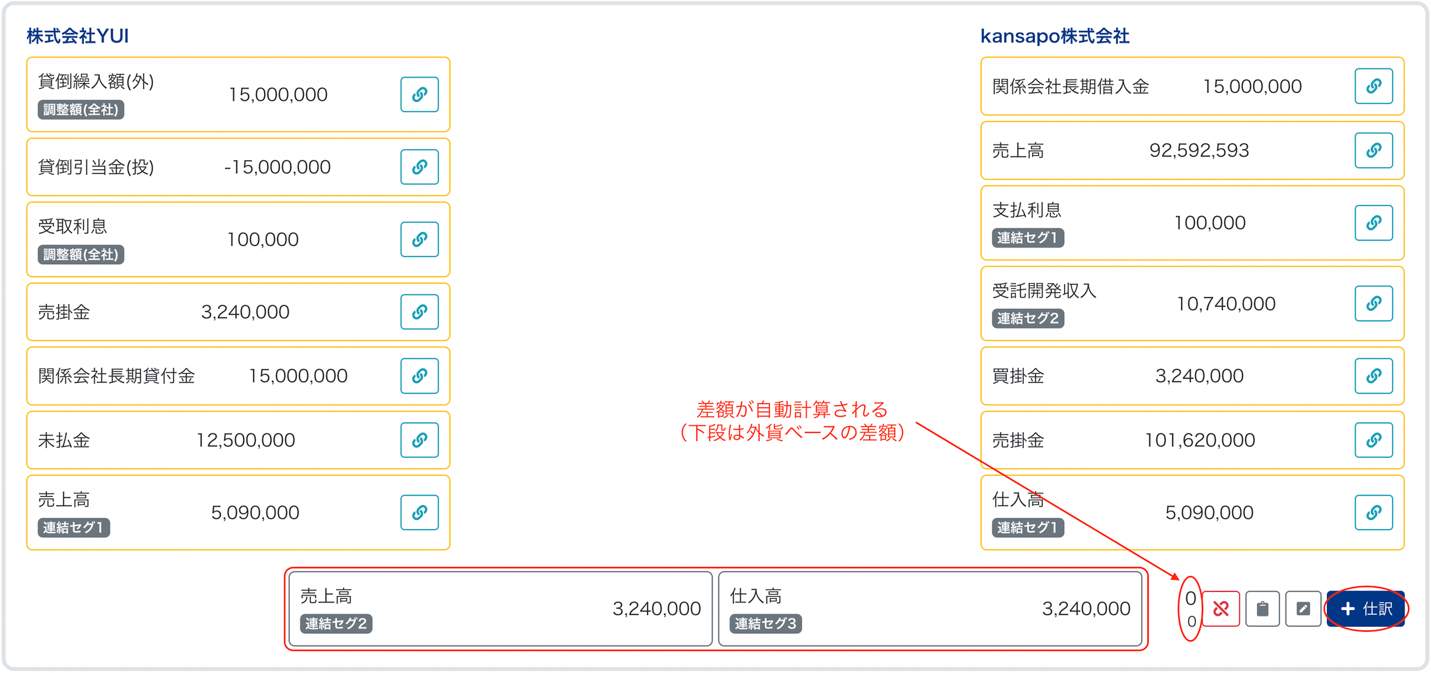 - マッチング結果(ここから「+仕訳」をクリックして子会社の科目と金額を追加して仕訳作成する)