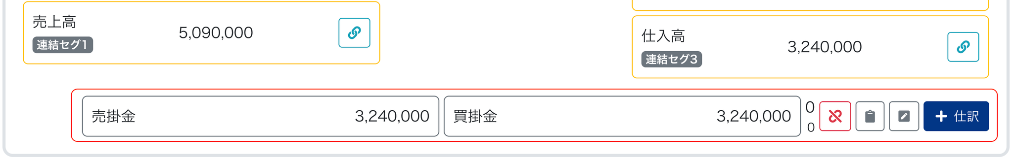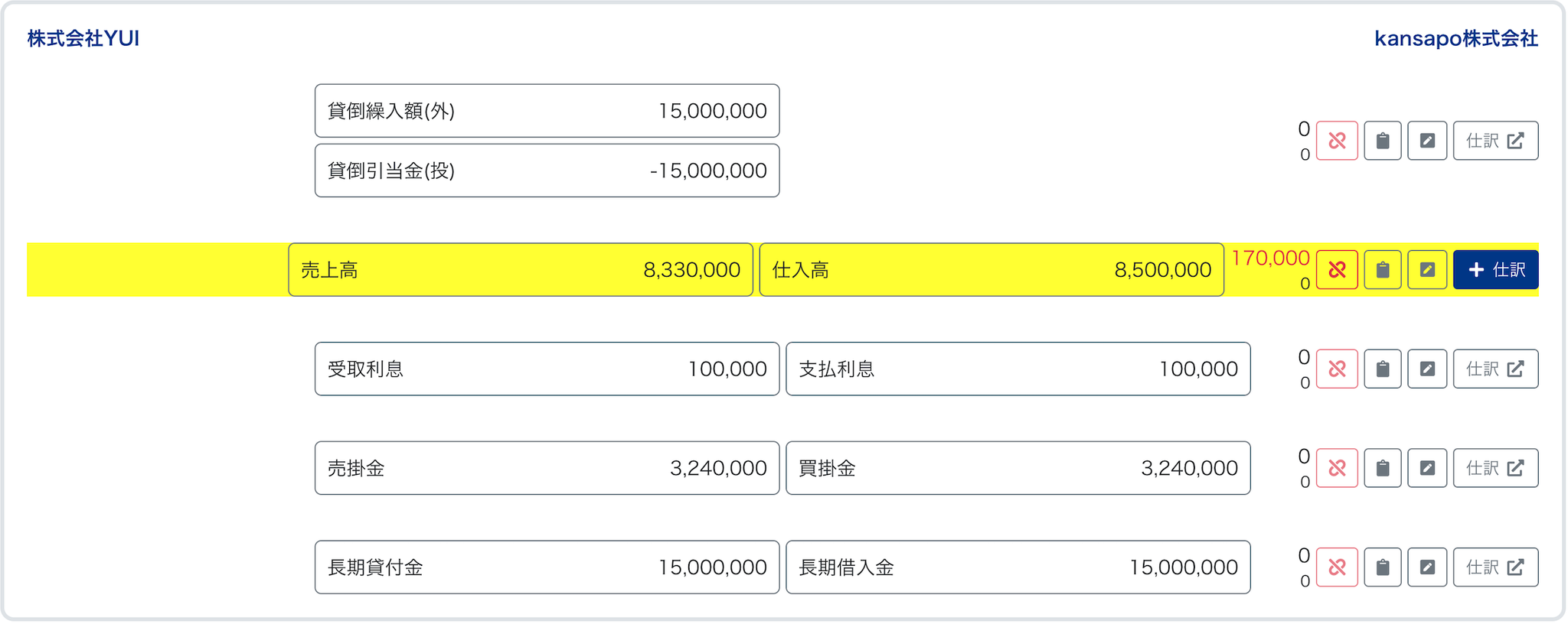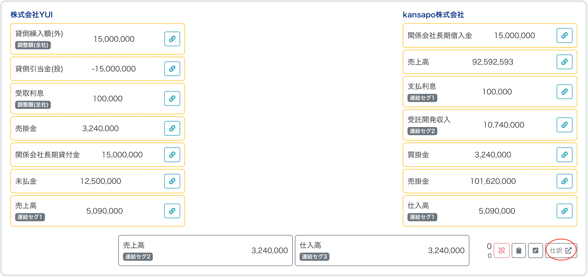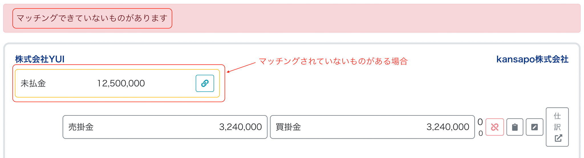- マッチング結果(ここから「+仕訳」をクリックして子会社の科目と金額を追加して仕訳作成する)