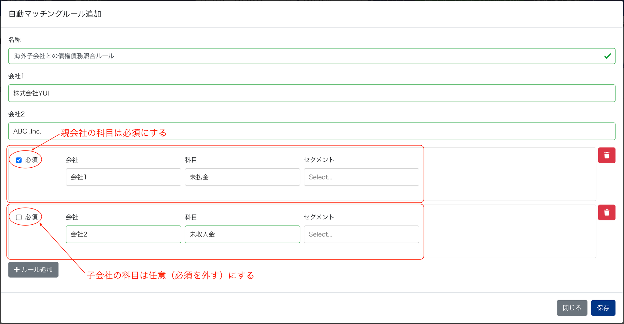 ※以下のルール例は、差額があった場合に子会社の科目で処理することによって結果的に親会社の残高に合わせて消去するルール例です