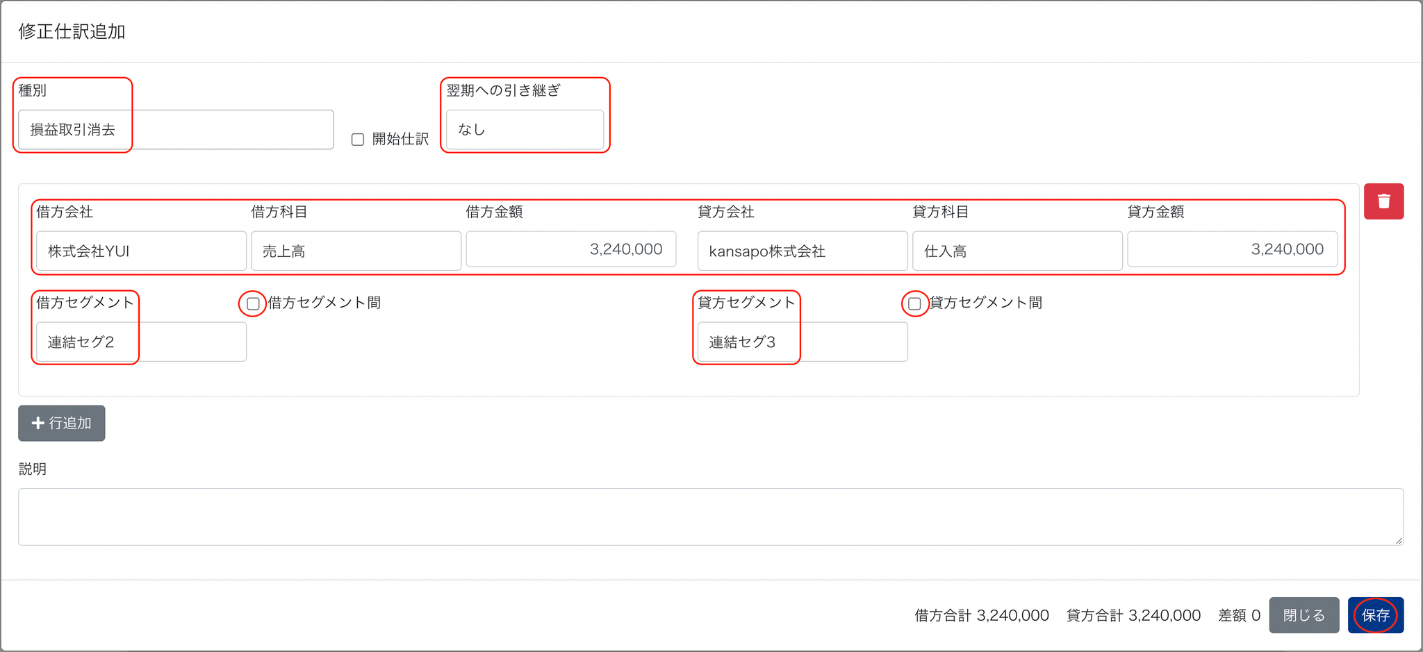 - 差額をその他資産等に計上したい場合は、「+行追加」をクリックして追加します
