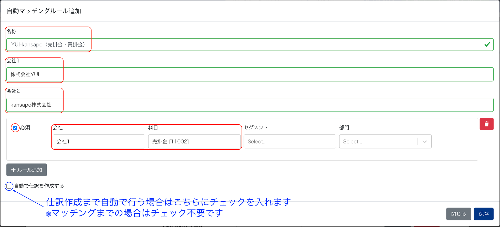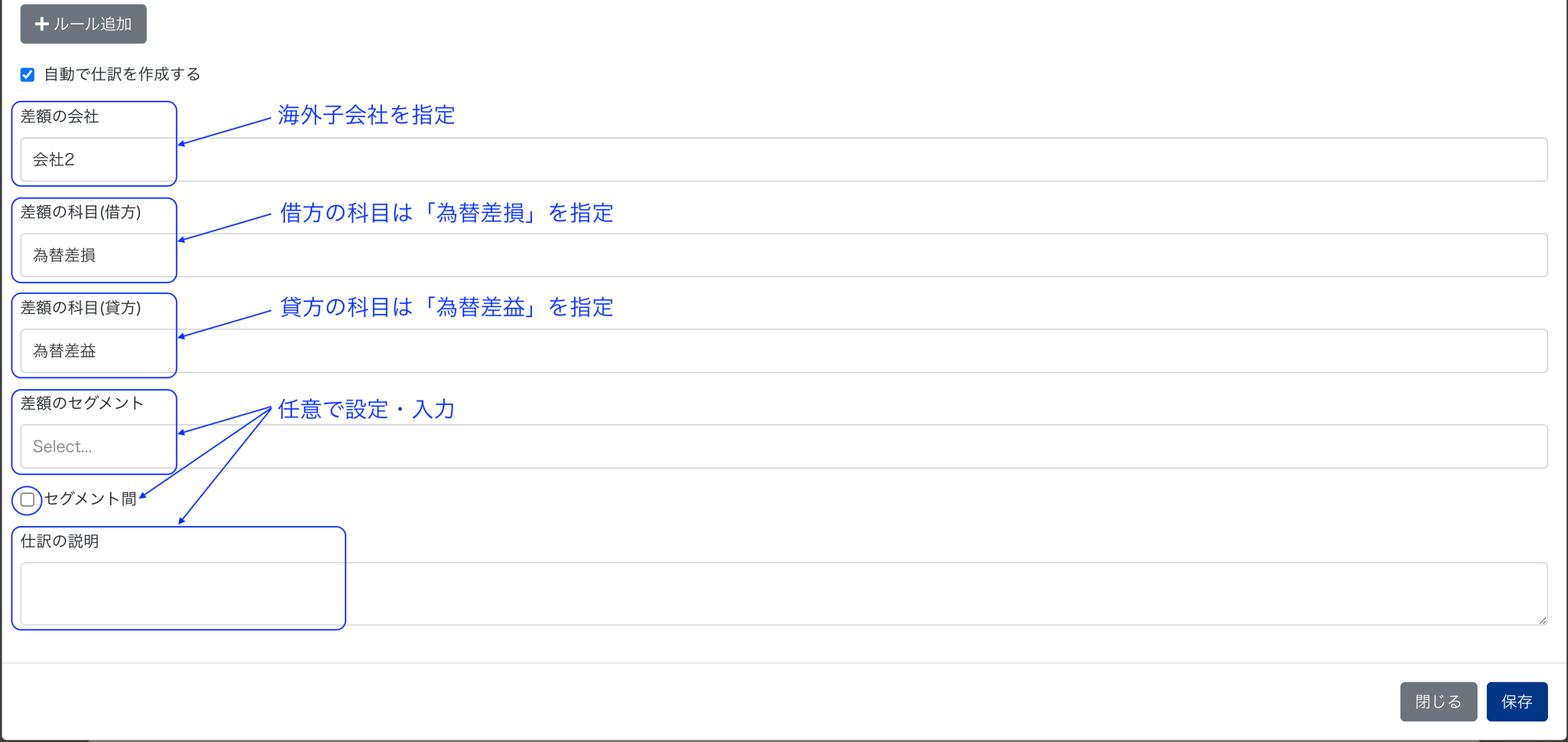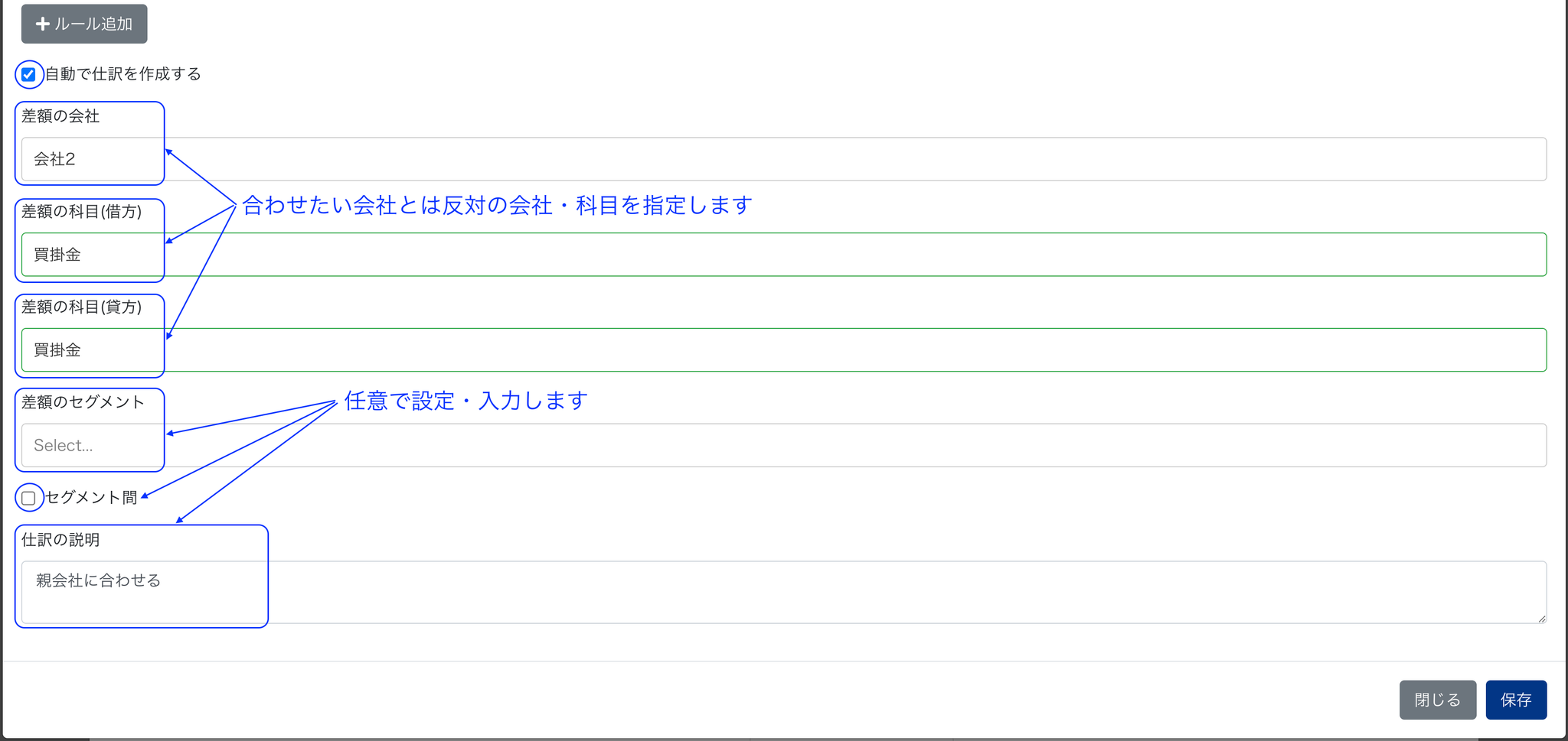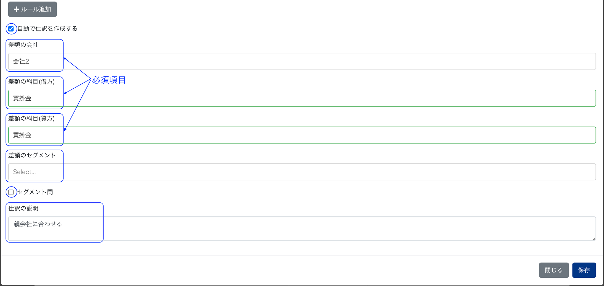 01 ルールの下にある「自動で仕訳を作成する」にチェックを入れて、「差額の会社」「差額の科目(借方)」「差額の科目(貸方)」「差額のセグメント」「セグメント間」「説明」を入力します