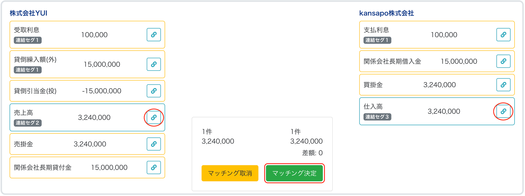 2①-2 マッチングする債権債務・取引高の🔗(リンクマーク)及び「マッチング決定」をクリックします