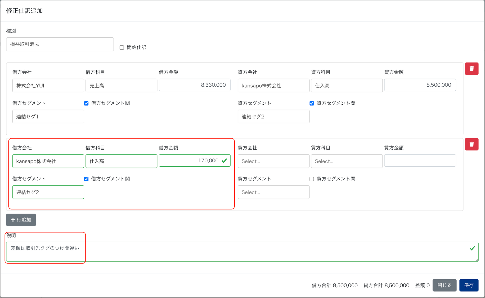 - 差異の原因がわかり、仕訳で調整する場合はそのまま仕訳作成し、差異については仕訳行を追加して調整します