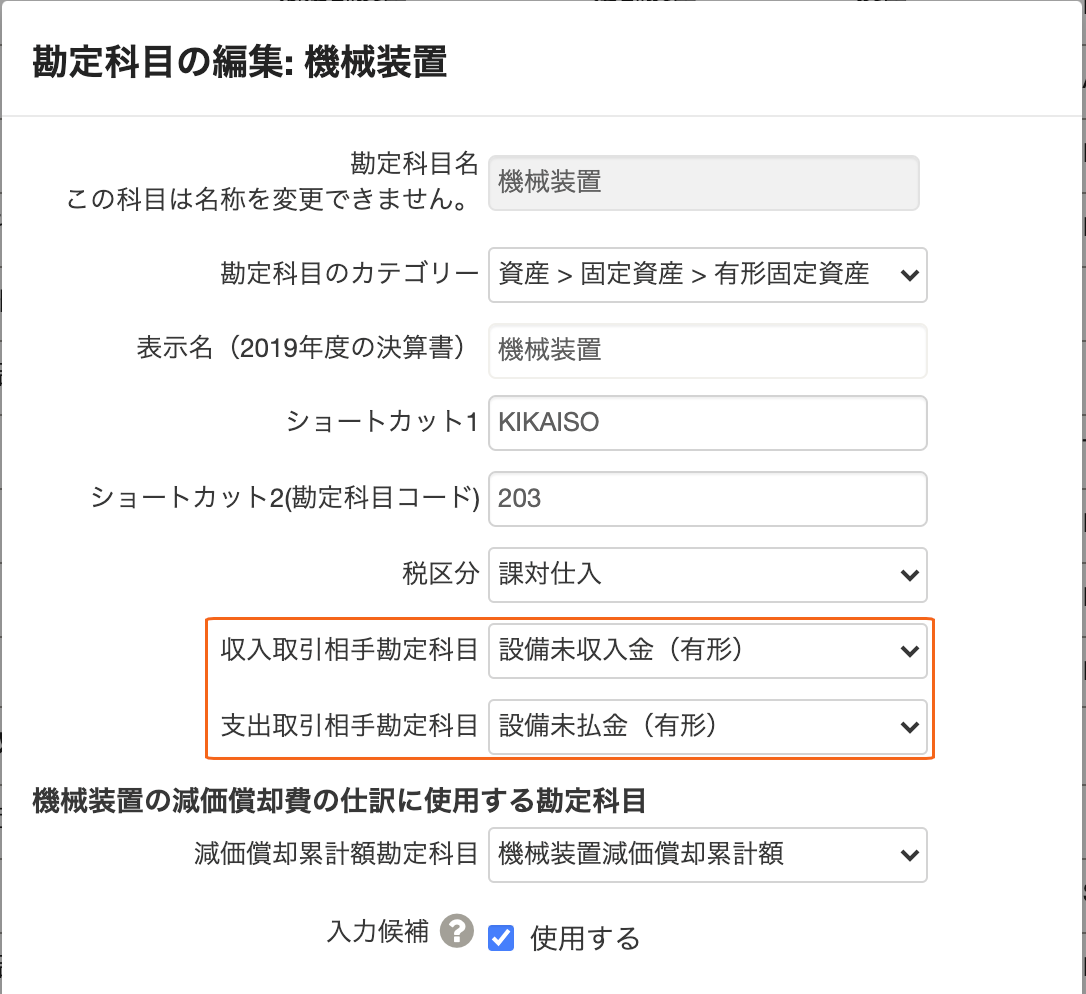 (例:機械装置の勘定科目の編集画面)