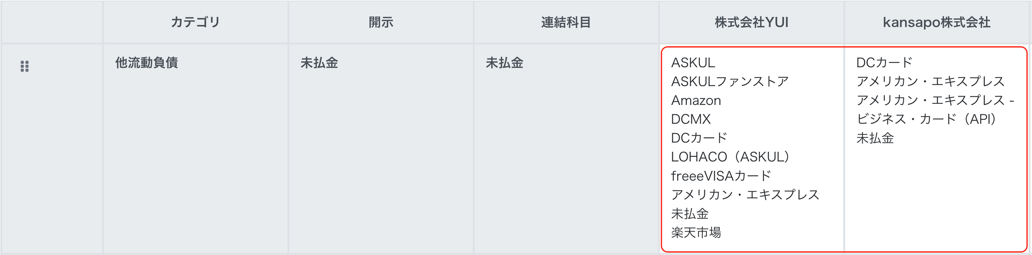 | (勘定科目名) | (科目コード) | (連結科目名) | (カテゴリ名) |