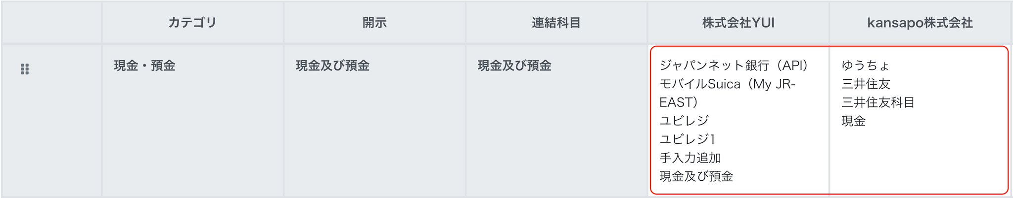 - 上記「Step3 連結科目を整備する」で作成した「現金及び預金」に口座(〇〇銀行等)を集約、及びfreee会計の勘定科目で存在している「未払金」にクレジットカード(△△カード等)を集約しておくと、連結精算表が非常に見やすくなりますのでおススメです