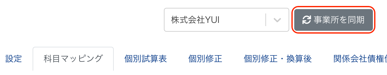 - 「事業所を同期」ボタンを押すことで同期されますが、その場合は親会社のAPI連携対象となる会計ソフト上の勘定科目が優先的に認識されます(YUI内で作成した科目が上書きされます)