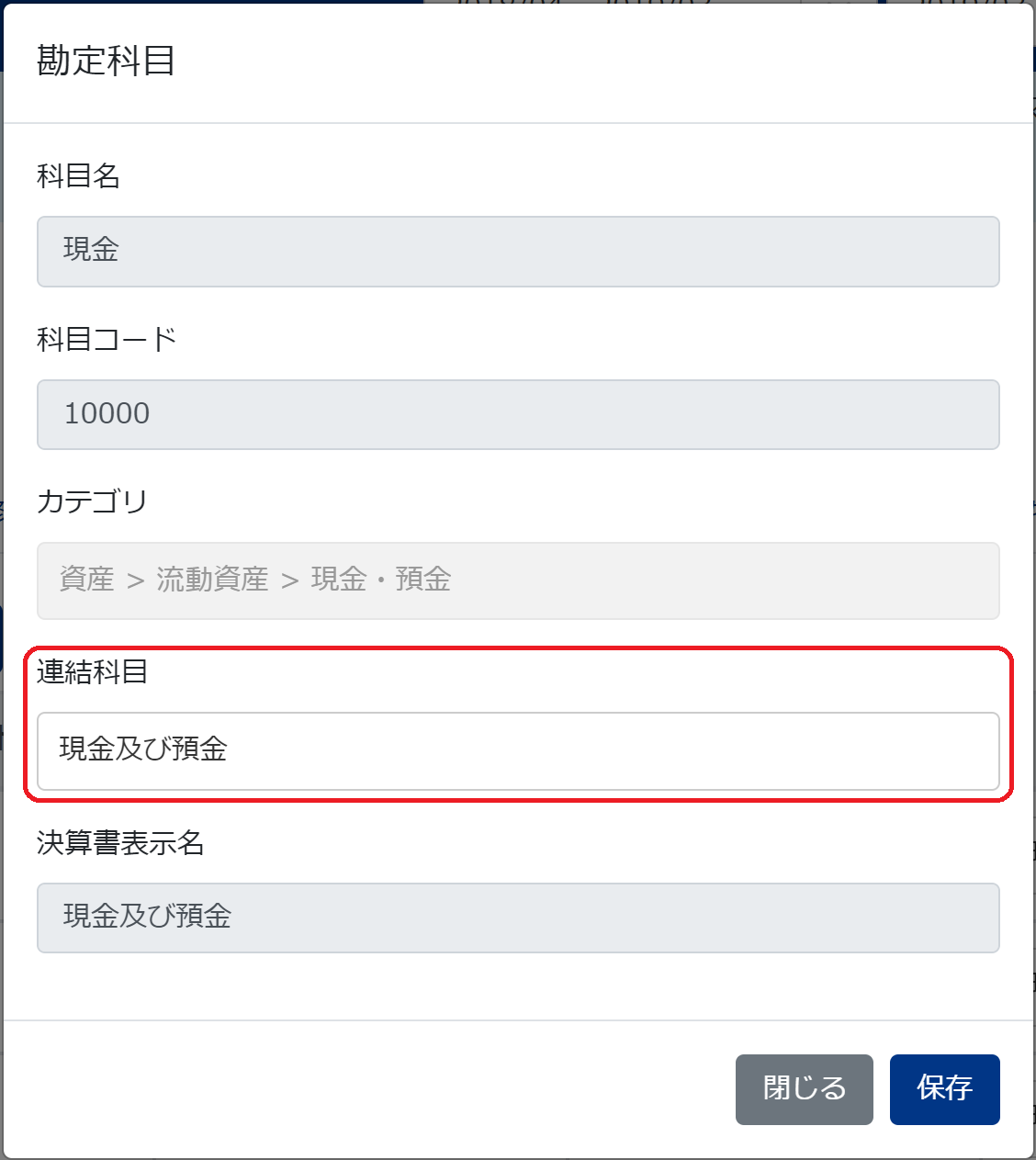- また、連結科目として追加する場合は「連結科目」欄は一旦空欄で保存し、保存後に選択してください。(保存後に同じ名称の連結科目を選択できるようになります)