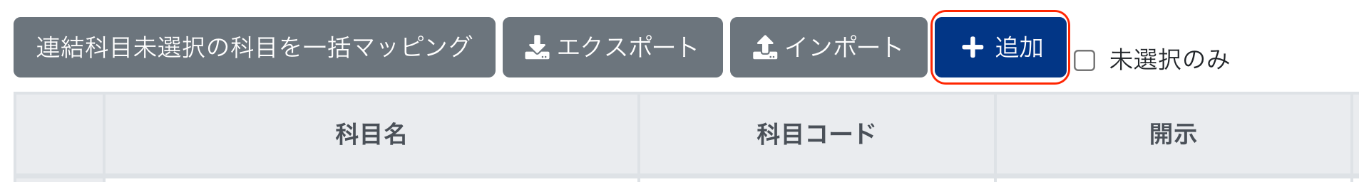 - 1つ目は親会社の科目マッピング画面で「+追加」ボタンをクリックして作成する方法