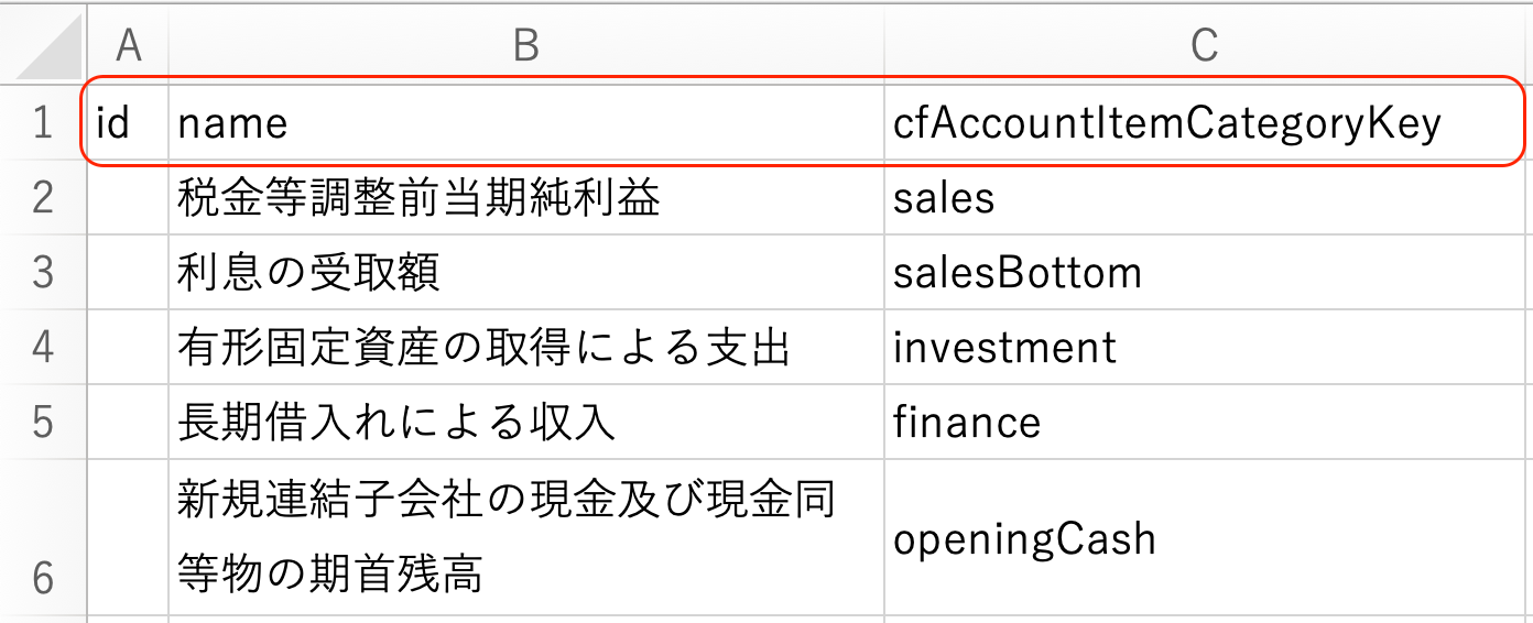 | id | 名称(name) | 科目コード(accountCode) | 区分(cfAccountItemCategoryKey) |