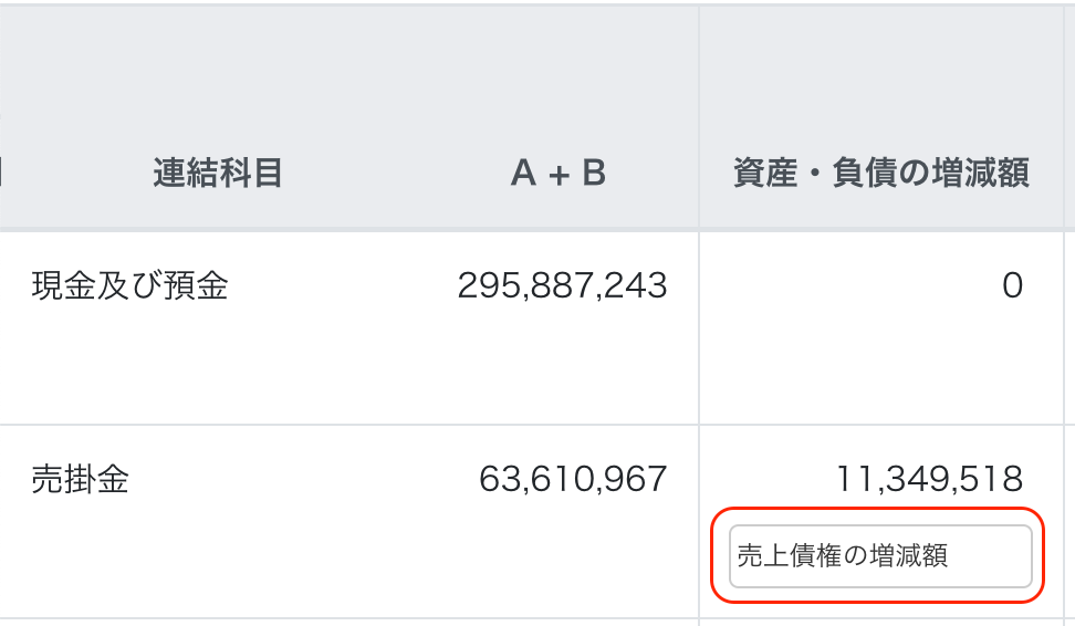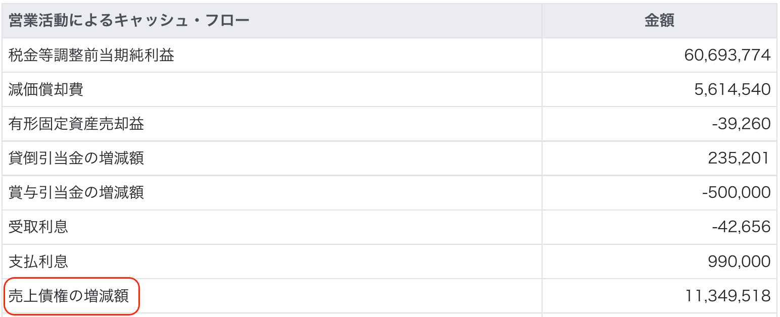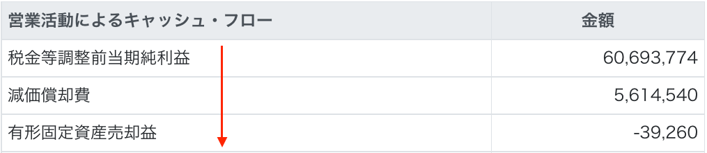 - 例:「税金等調整前当期純利益」「売上債権の増減額」など