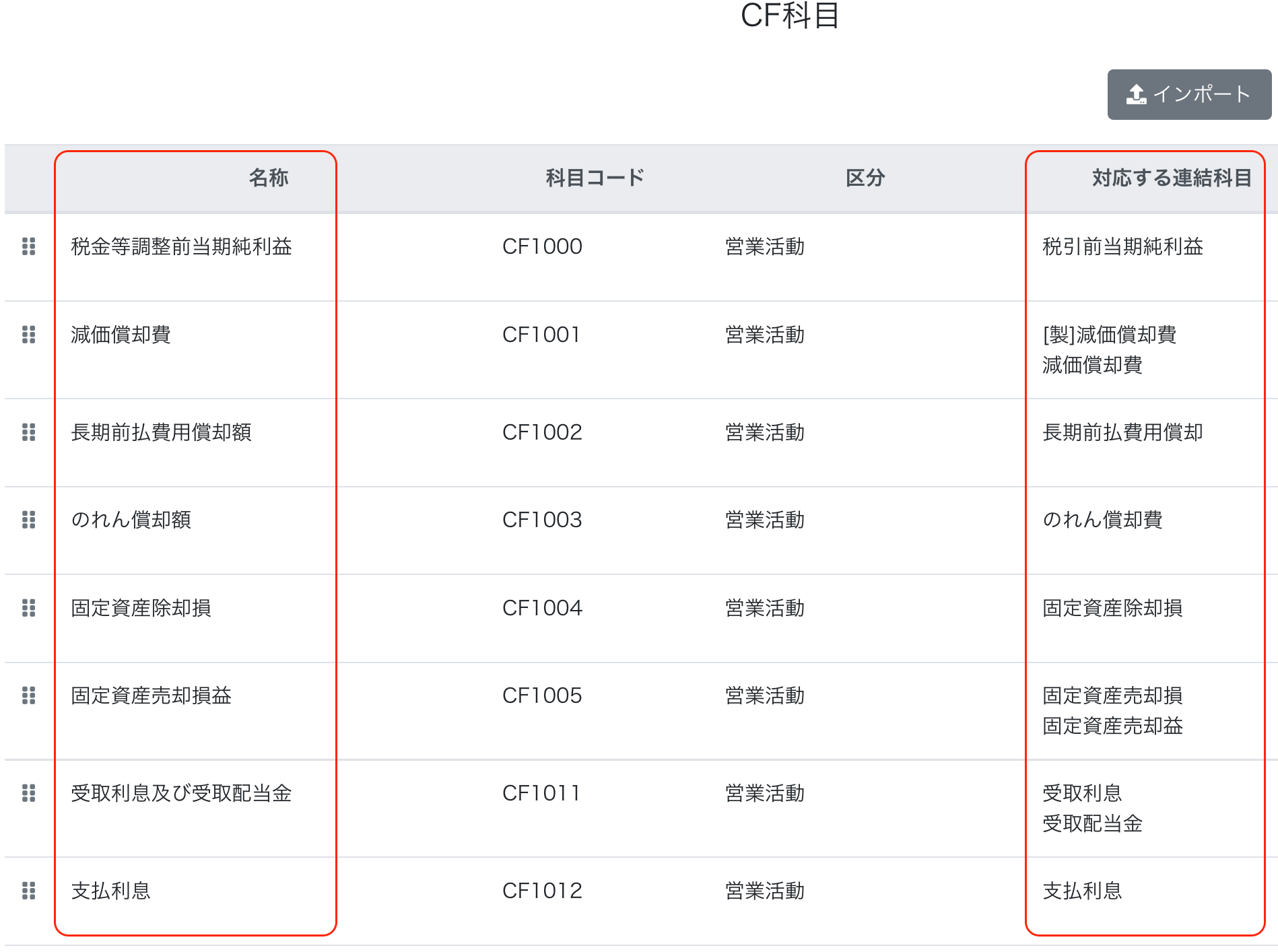 - 「CF科目」は、連結CF計算書に表示する科目のことです