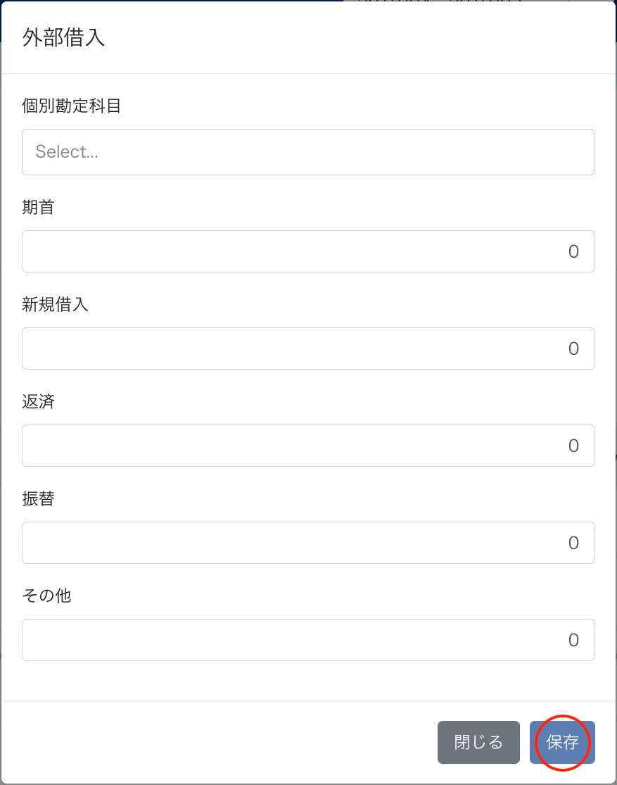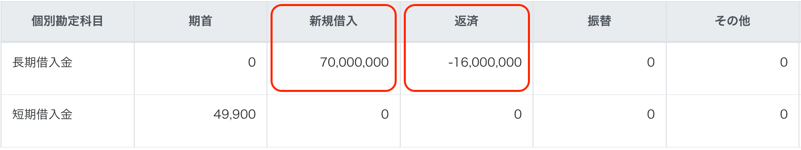 | (入力不要) | (個別勘定科目) | (期首残高) | (新規借入金額) | (返済金額) | (振替金額) | (その他金額) | (入力不要) | (期末残高) |