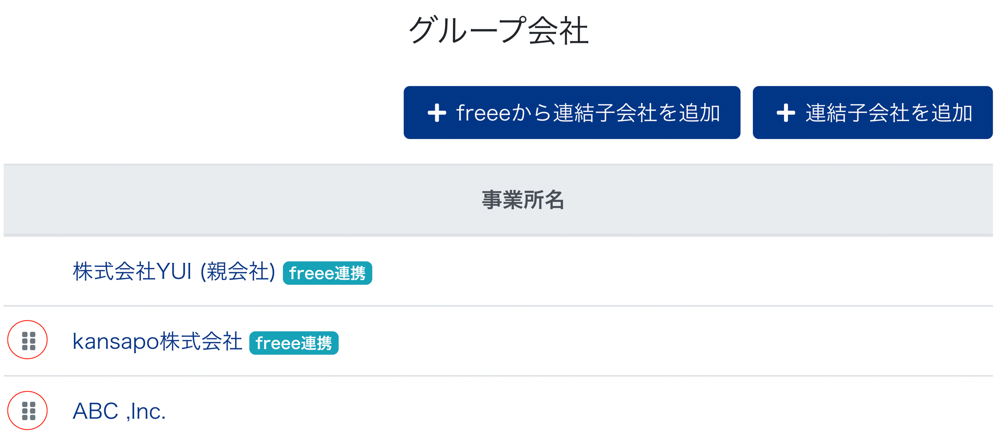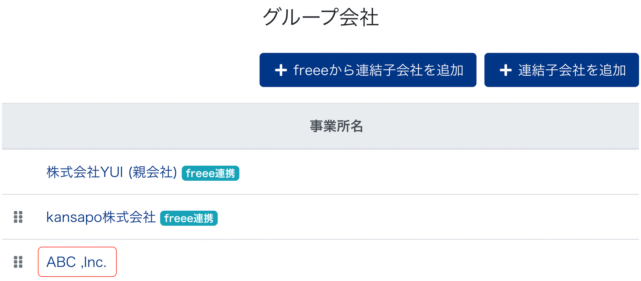 - 以下の赤丸で囲っているマークをドラッグ&ドロップして子会社の順番を入れ替えることができます