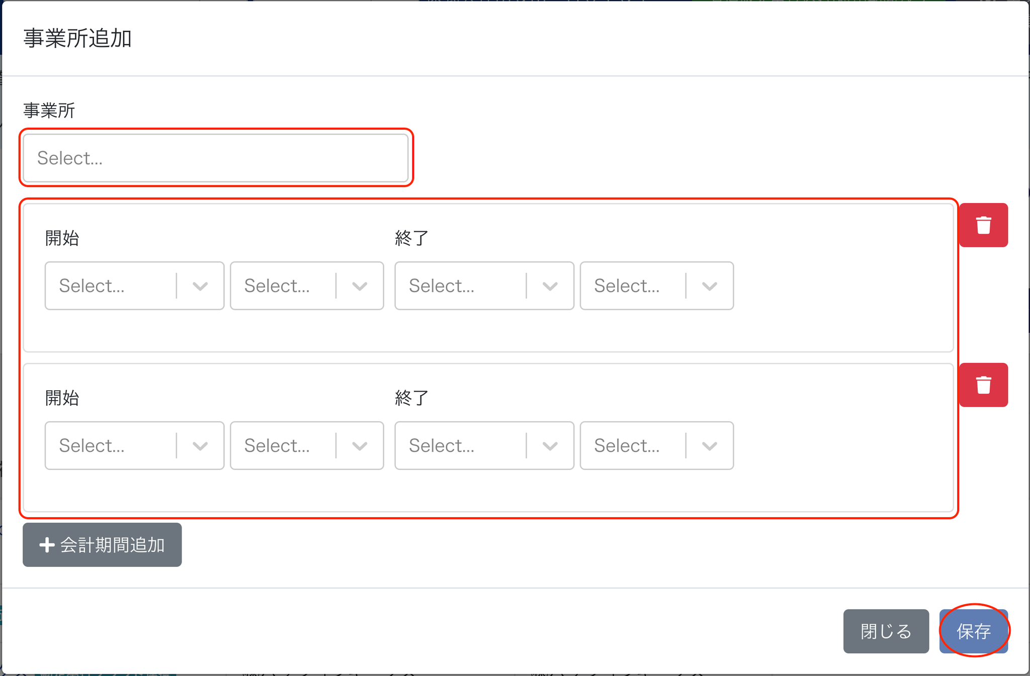 2-3 「事業所」から追加する子会社を選択&会計期間を設定します