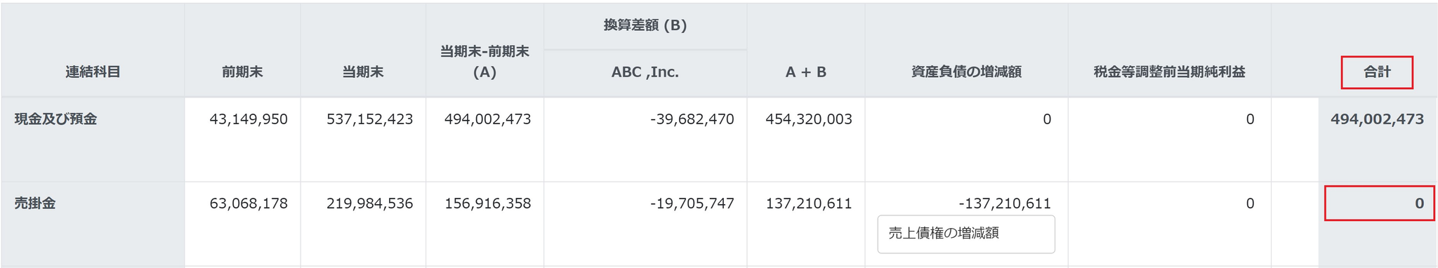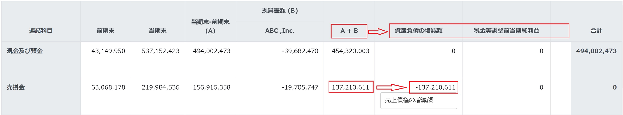 - (C)または(D)の登場により、CFマッピングを設定する において指定した「換算差額等を除いた増減(A+B)」は、(C)または(D)の数字を調整した以下の金額になっていますので、特に従来の設定を変更する必要はありません。