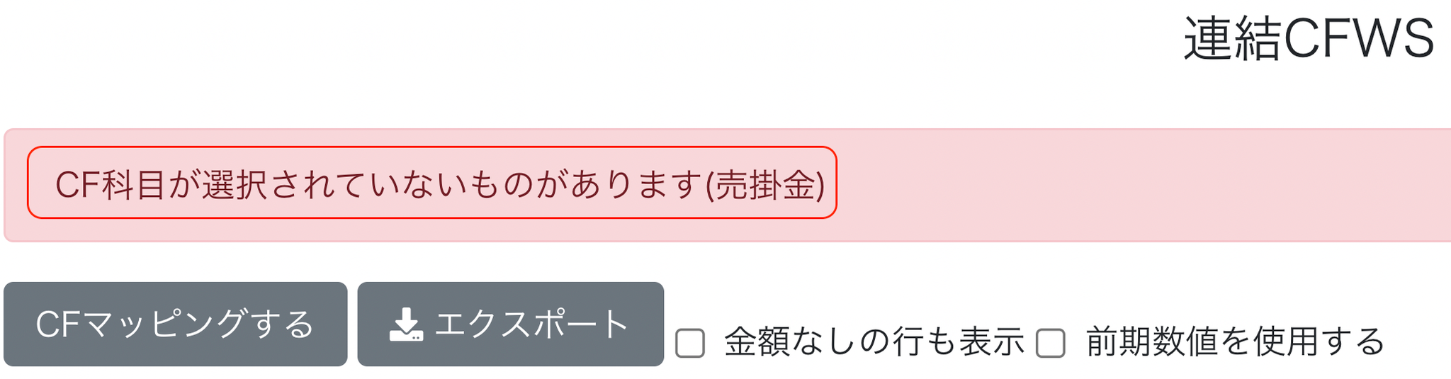 - このエラーが出た場合は、再度CFマッピング画面に戻っていただき、該当の連結科目の設定を修正してください