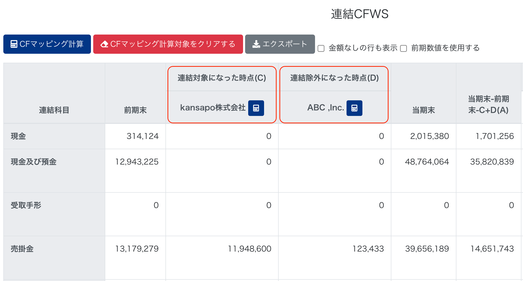 - 個社連結PKGの設定タブにて年月を設定すると、連結CFWSの「前期末」と「当期末」の間に「連結対象となった時点(C)」及び「連結除外となった時点(D)」列が表示されます