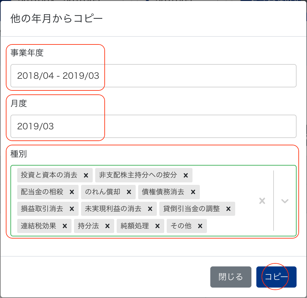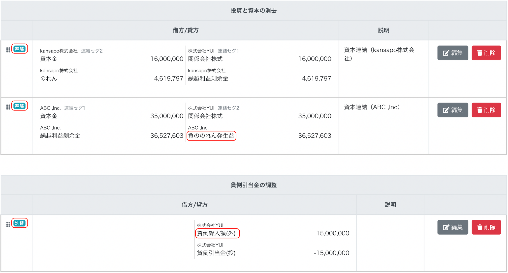 | 仕訳種別 | 必須 | プルダウンより選択(のれん償却、など) | プルダウンより選択(未実現利益の消去、など) |