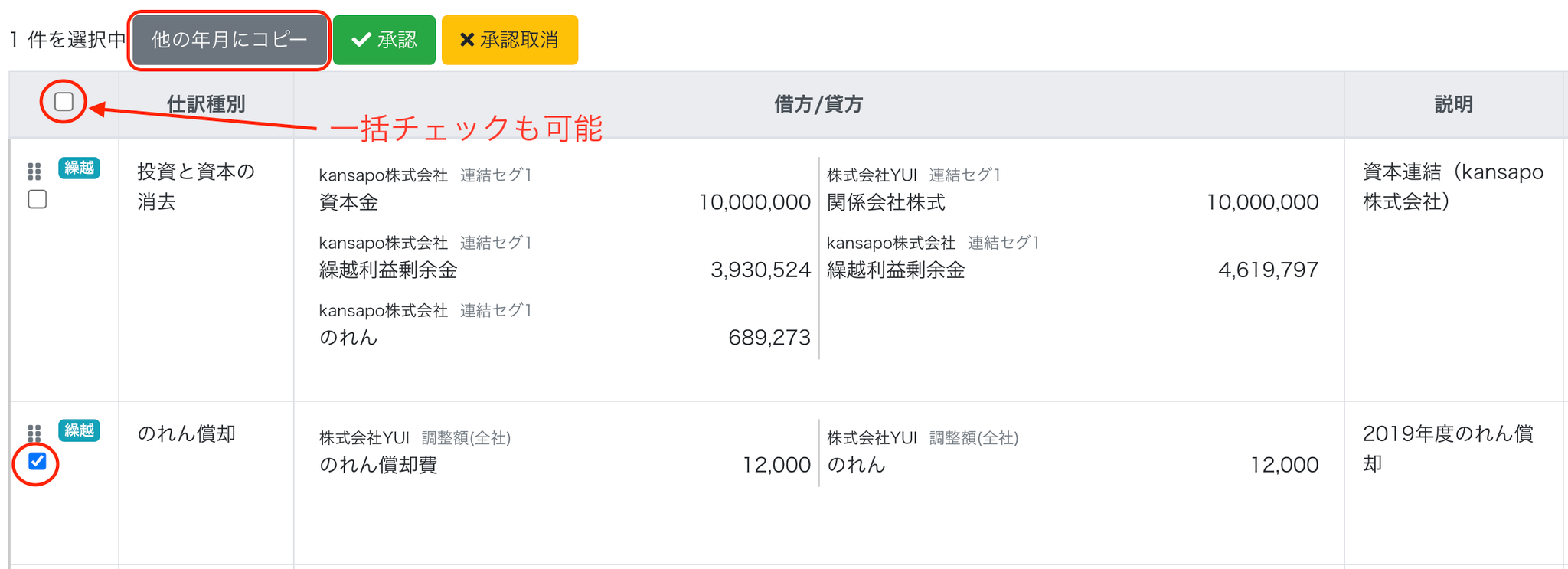 8-1 他の年月にコピーしたい仕訳を選択します(複数選択、一括選択可能)