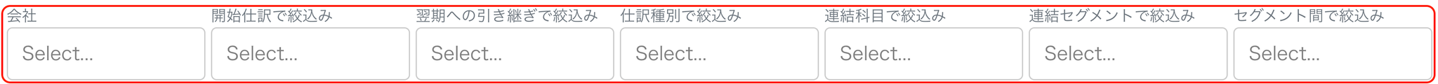 - 画面上にある絞り込みボックスにて、「会社」「開始仕訳」「翌期への引き継ぎ」「仕訳承認」「仕訳種別」「連結科目」「連結セグメント」及び「セグメント間」で絞り込むことができます
