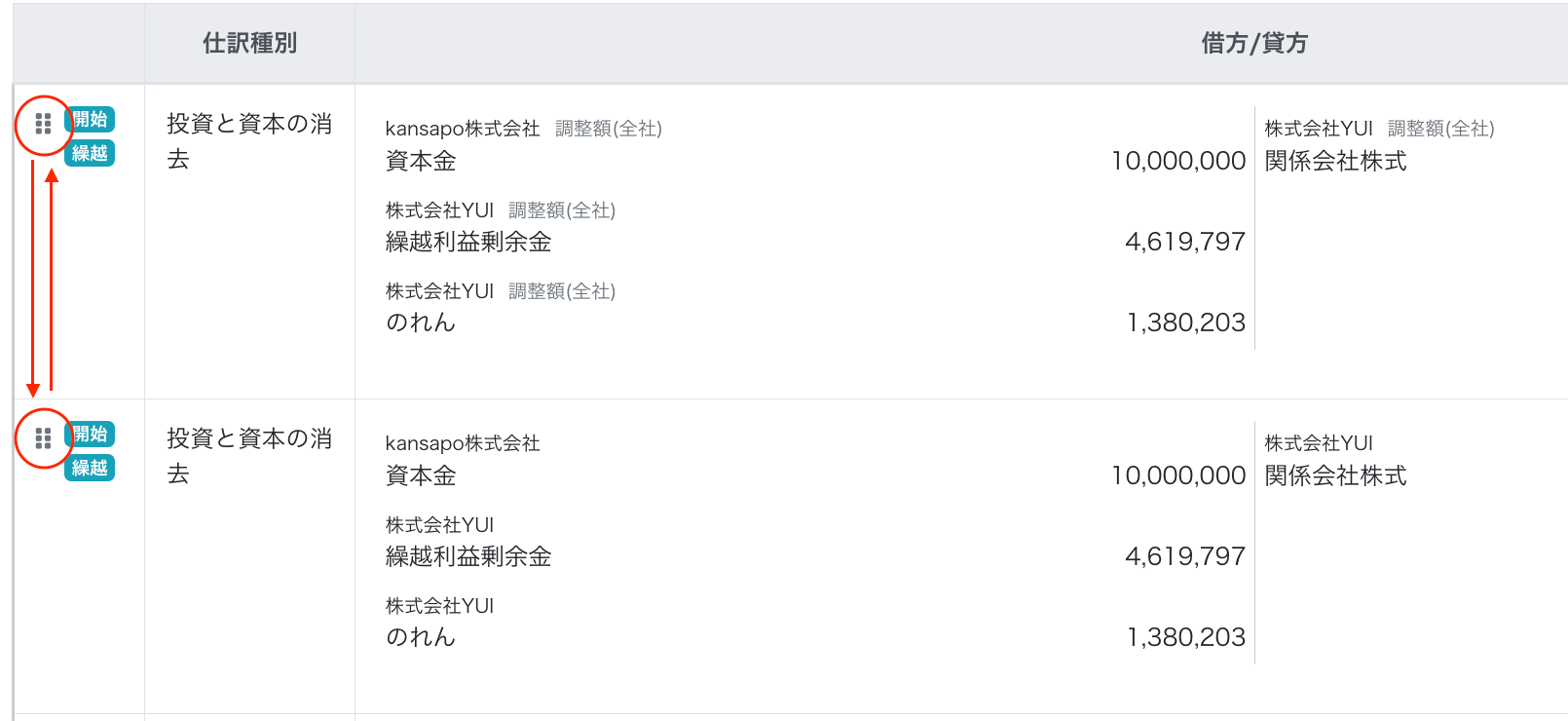 - 理由は、「開始・連結仕訳」画面にて、「仕訳種別ごと」かつ、その中で「会社の組み合わせごと」に自動で並び替えられるため、1つの仕訳で3社以上登場させない仕様になっています