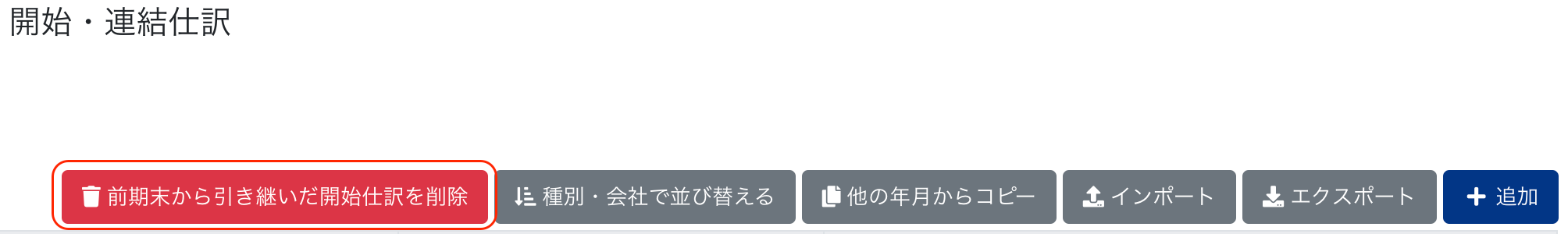 - 上記作業により開始仕訳を引き継いだ場合、ボタンが「前期末から引き継いだ開始仕訳を削除」に変わりますので、こちらをクリックします