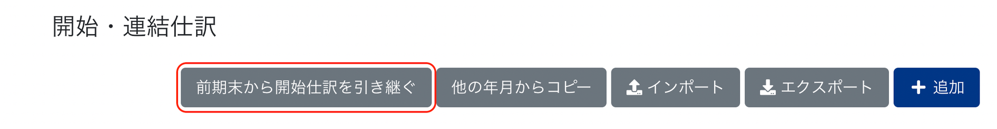 - 例えば、翌期の最初の月の「開始・連結仕訳」画面にて「前期末から開始仕訳を引き継ぐ」ボタンをクリックします(翌期のどの月でもご利用いただけます)