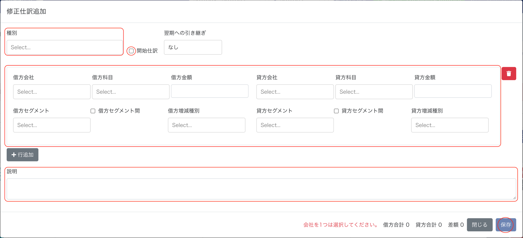 ① 借方会社または貸方会社いずれか1つは入力しないと保存できません