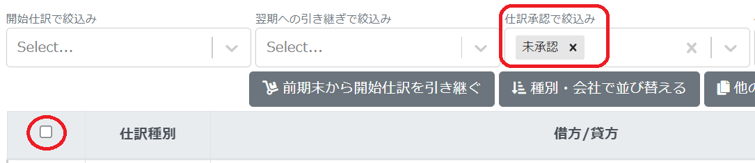 - 「仕訳承認で絞込み」のところで「未承認」で絞り込み、一括チェックボックスにチェックします