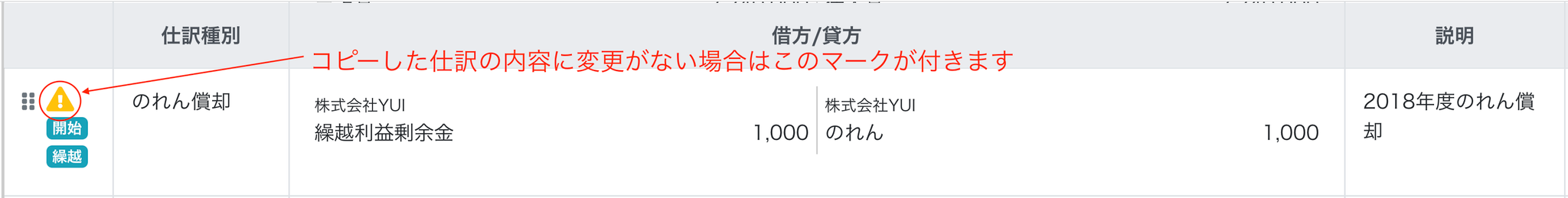 8-3 コピーした仕訳の変更の有無を「⚠️」マークで管理します(カーソルを合わせると「コピーされてから変更がありません」と表示されます)