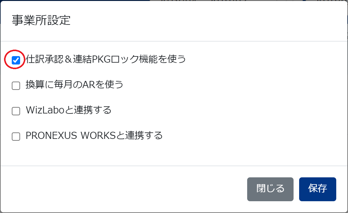 - 仕訳承認機能は、内部統制機能の一環で「連結PKGロック」についても同時に機能オンとなりますのでご了承ください