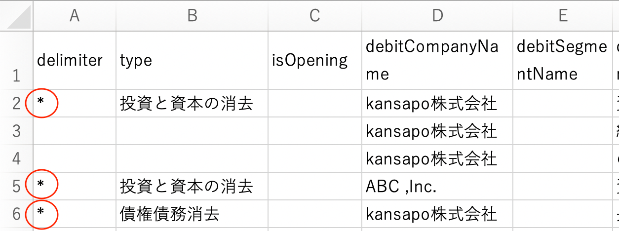 | delimiter | type | isOpening | inheritType | debitCompanyName | debitSegmentName | debitAccountItemName | debitChangeType | debitAmount | debitIsIntersegment | creditCompanyName | creditSegmentName | creditAccountItemName | creditChangeType | creditAmount | creditIsIntersegment | description |