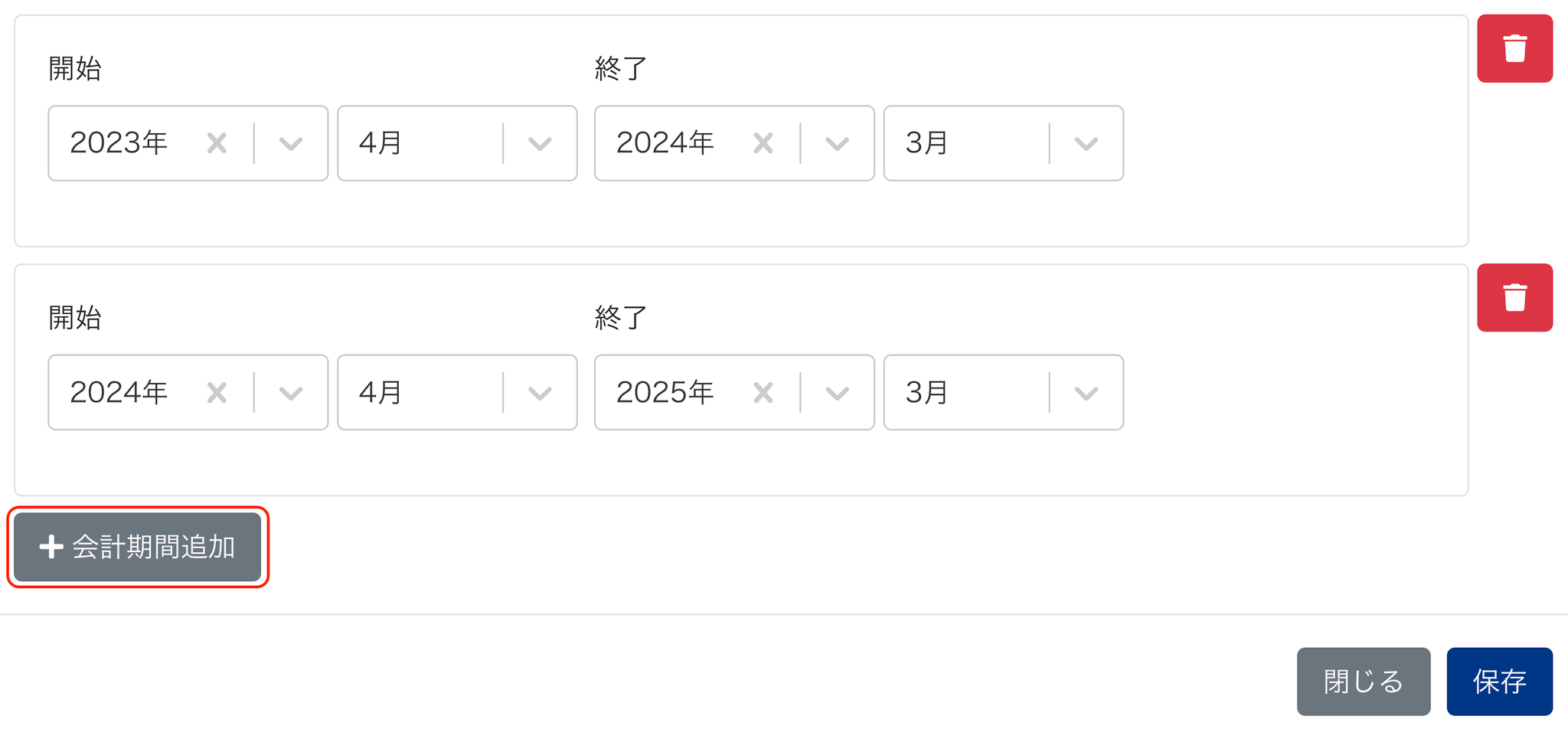 2-2 「+会計期間追加」をクリックして保存します
