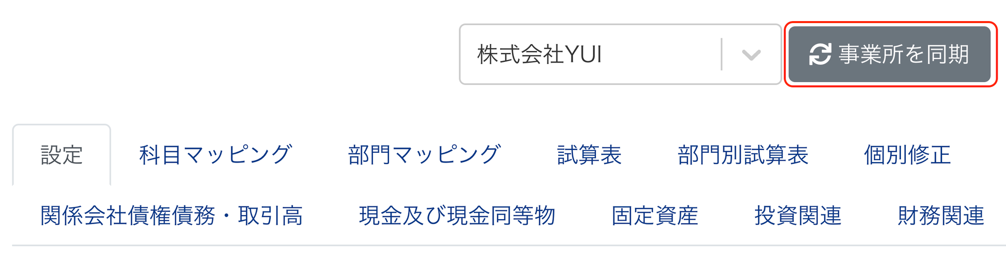 - 年度締めをして新しい事業年度の情報をYUIに同期したい場合は、再度親会社の個社連結PKG画面にある「事業所を同期」ボタンをクリックしてください