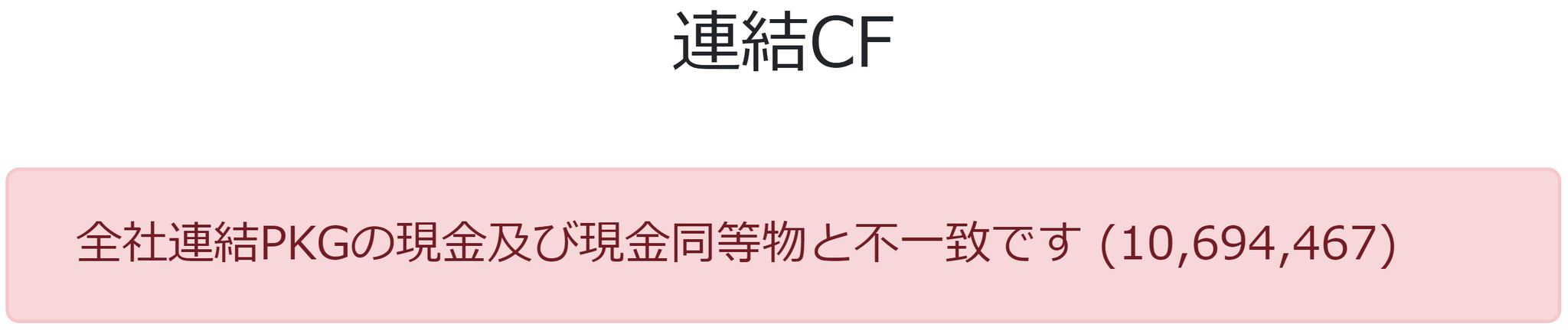 - 全社連結PKGの「現金及び現金同等物」の合計額と、連結CFの「現金及び現金同等物の期末残高」が一致しているかYUIで自動チェックされ、差額がある場合はエラーが表示されます