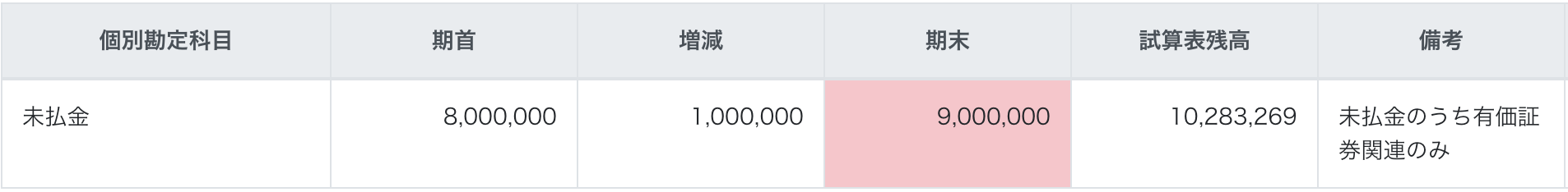 - 例えば、未払金勘定の中に有価証券にかかる未払金がある場合は、期末と試算表残高が不一致となり赤くなりますが、備考欄に理由を記載するなどしてください