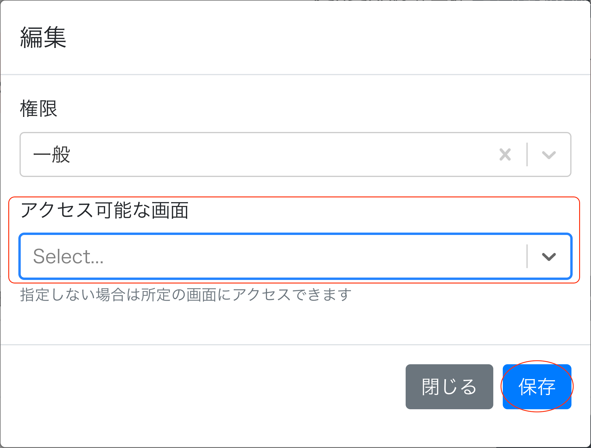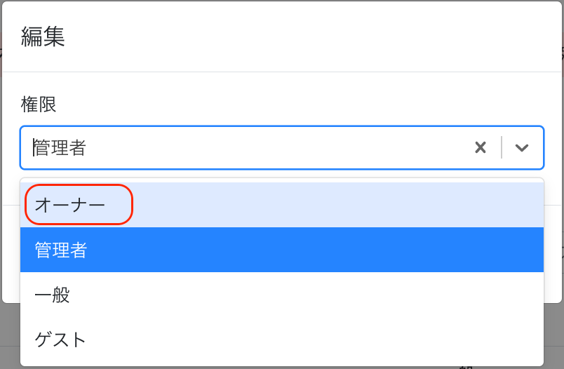 - ユーザー画面にて、権限をプルダウンから選択して変更してください(オーナー権限及び管理者権限の方が変更可能)