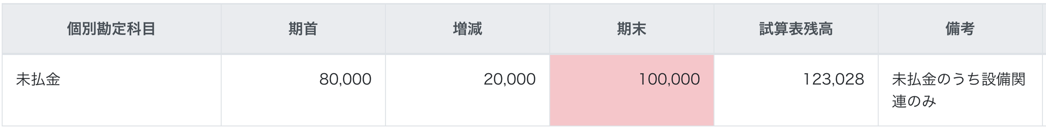 - 例えば、未払金勘定の中に設備にかかる未払金がある場合は、期末と試算表残高が不一致となり赤くなりますが、備考欄に理由を記載するなどしてください