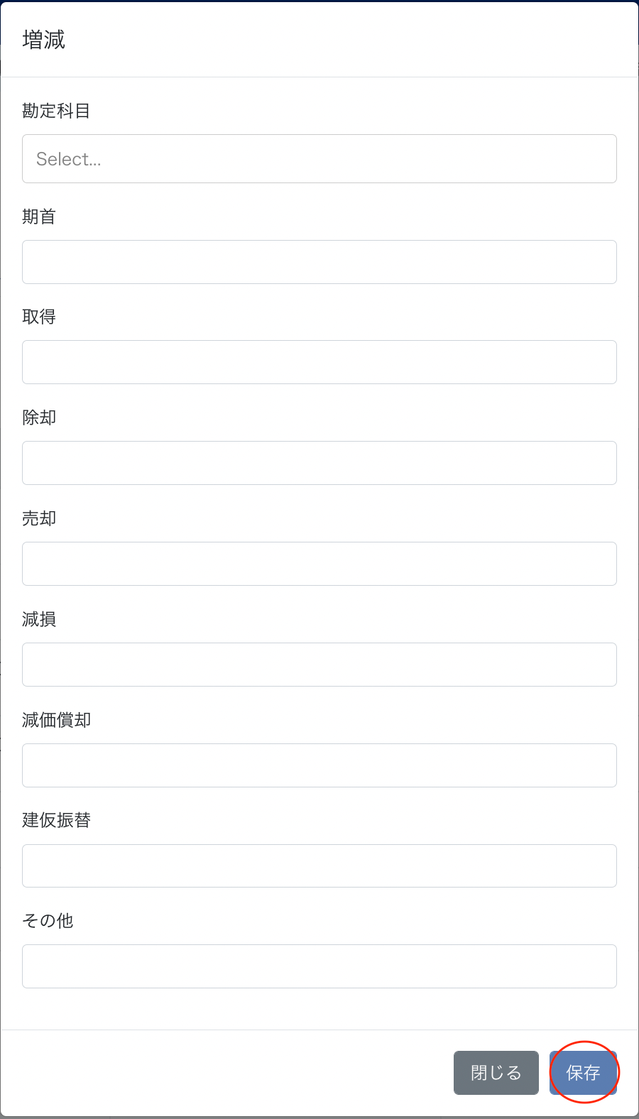 | (入力不要) | (個別勘定科目) | (期首残高) | (増減) | 期末残高 | (備考) |