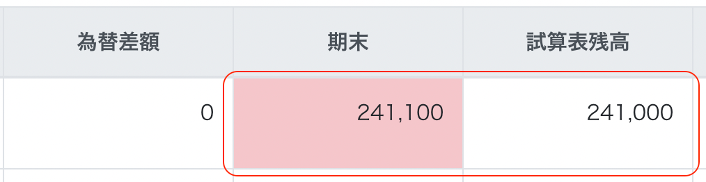 - その後内容を編集したり最新版の試算表の数字が更新されると不一致となり、期末の金額欄が赤くなります