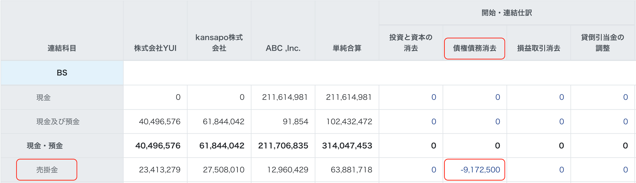 - 連結精算表は以下の項目が表示されます