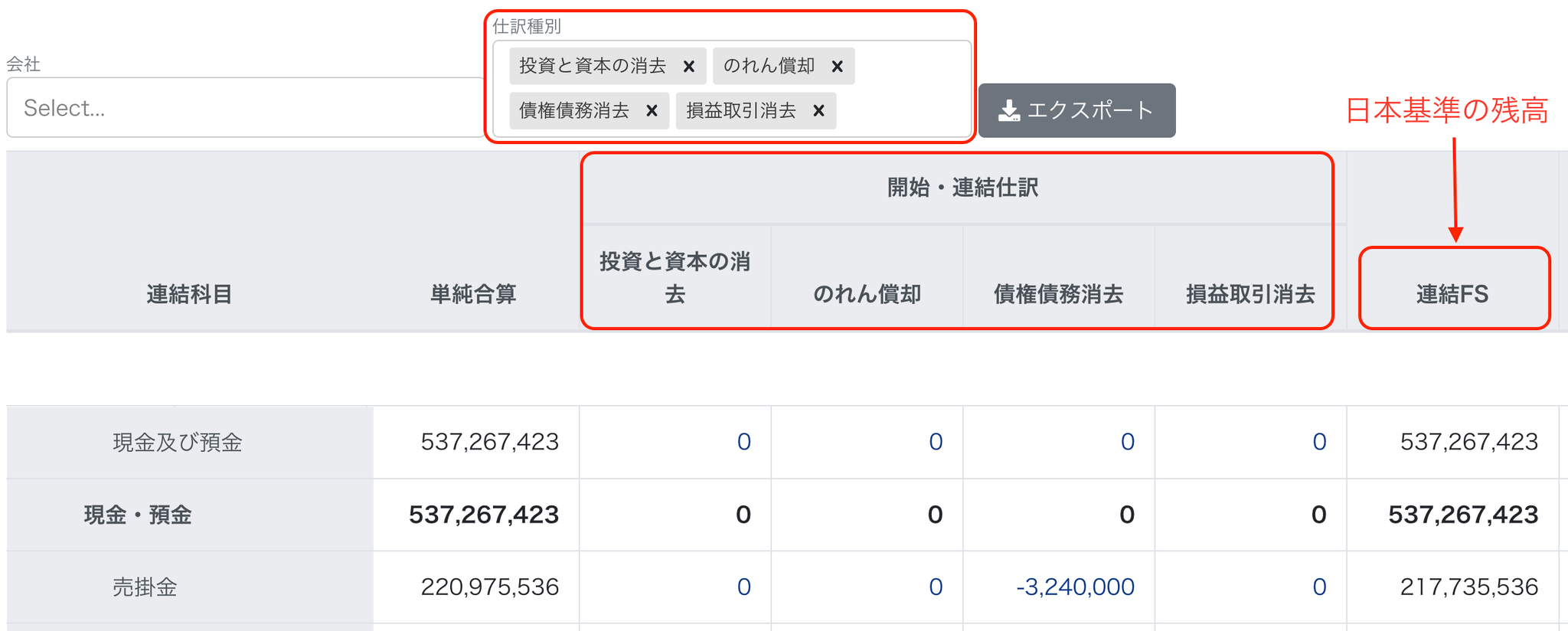 - これにより、「IFRS関連の仕訳種別」を除いた日本基準の残高が「連結FS」列に表示されます