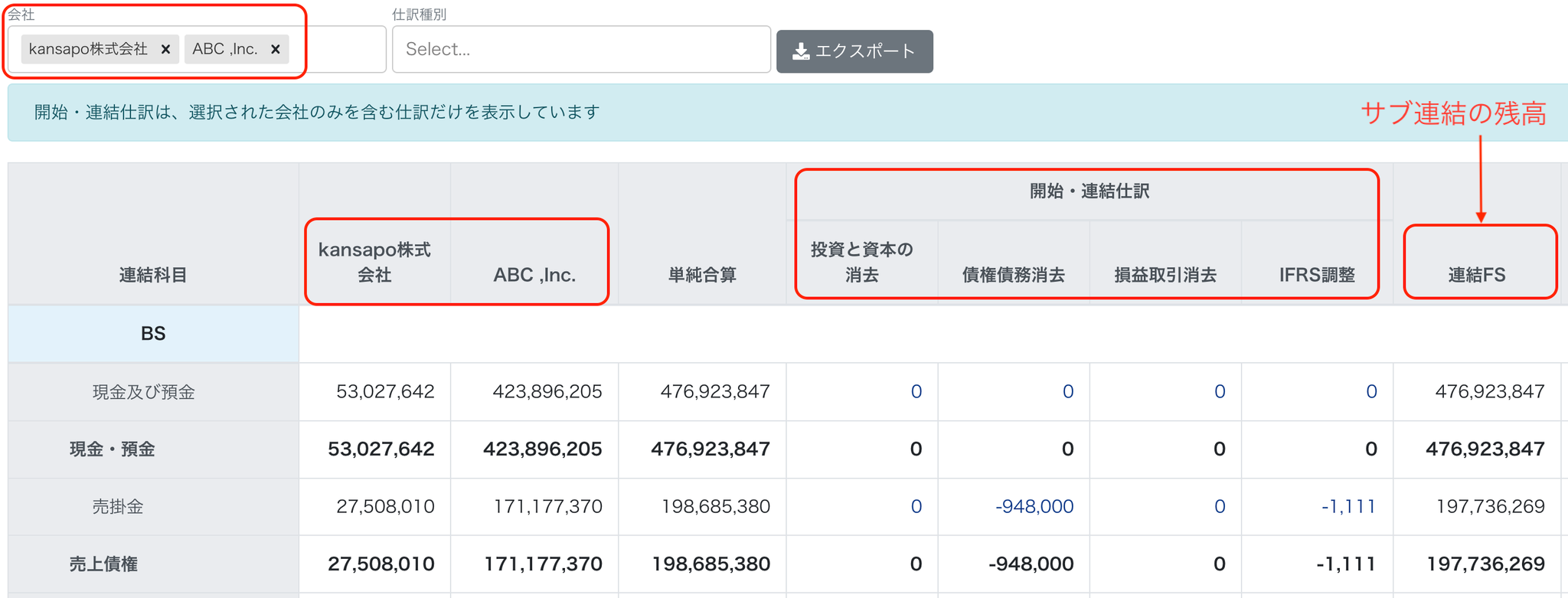2-4 「会社」「仕訳種別」で絞り込んで『サブ連結』『日本基準』『IFRS基準』の残高を確認する