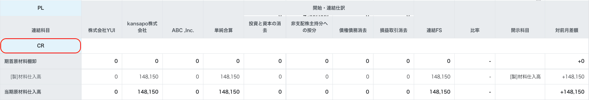 - 翌期月初(3月決算の場合、4月)の連結精算表のPL・CRの「対前月差額」については前年度末との比較になりますので、単月の数字をみたい場合は「連結FS」列の数字をご利用ください
