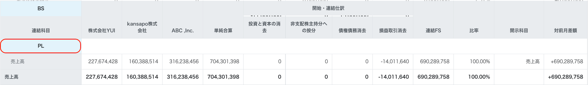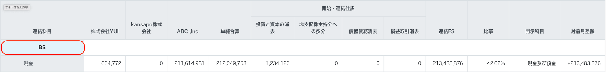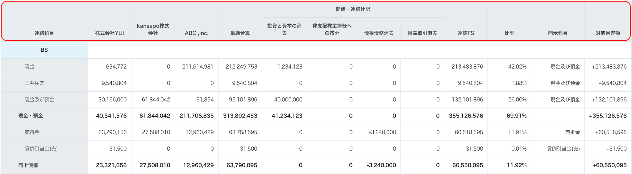 | 連結科目 | 各社の個別修正・換算後の金額 | 単純合算 | 各連結仕訳の種別ごとの金額 | 連結FSの金額 | 比率 | 開示科目 | 対前月差額 |
