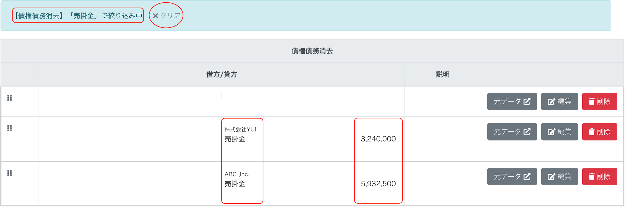 - 「×クリア」をクリックすると、科目での絞り込みがなくなり該当する科目を含む仕訳のみが表示されます